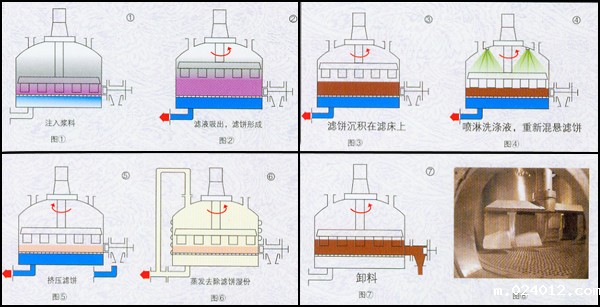 6、清洗彻底:由于此设备具有自动喷淋和重新打浆的功能,滤饼可以得到非常彻底的清洗。并且洗涤液用量较其它类型设备少,可减少排污量和降低废水处理费用。