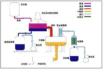 4、操作连续:能够使过滤和干燥在一个连续的系统内进行,毋须处理湿滤饼。在过滤器下可以连接一个干燥器,使湿滤饼直接卸入干燥器,干燥后的产品可以机械传送至称量、包装等工段。